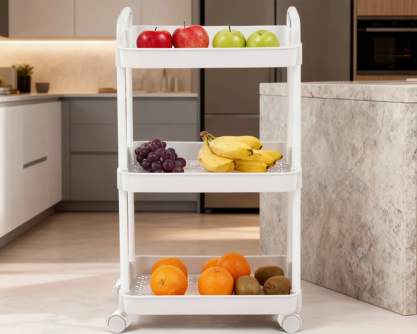 Carrinho Organizador Slim -Fácil de montar, com 3 prateleiras multiuso de plástico.